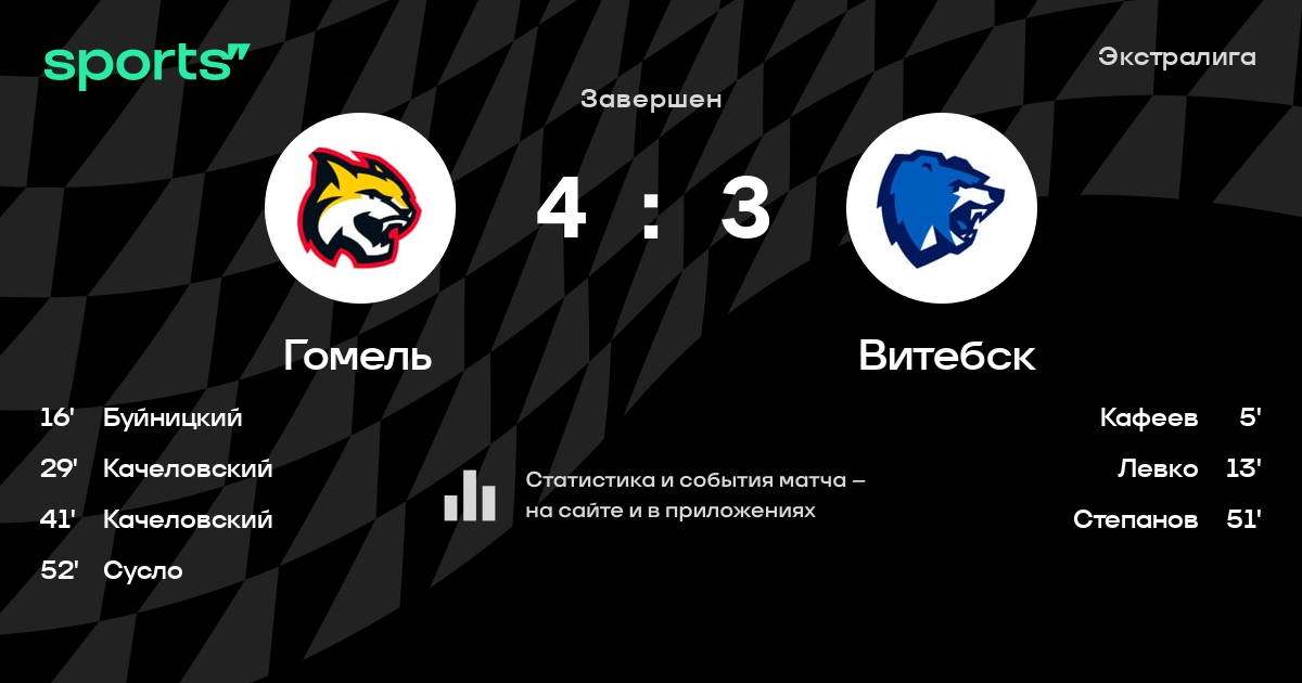 В прошедшем матче в рамках турнира Экстралига состоялась встреча команд Гомель - Витебск в городе Гомель (Беларусь) на стадионе Ледовый дворец Гомель (вместимость - 2700)