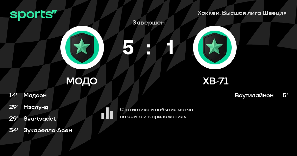 В прошедшем матче в рамках турнира Хоккей. Высшая лига Швеция состоялась встреча команд МОДО - ХВ-71