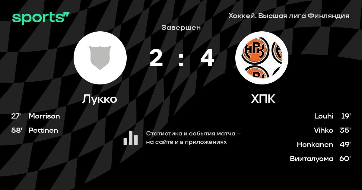 В прошедшем матче в рамках турнира Хоккей. Высшая лига Финляндия состоялась встреча команд Лукко - ХПК