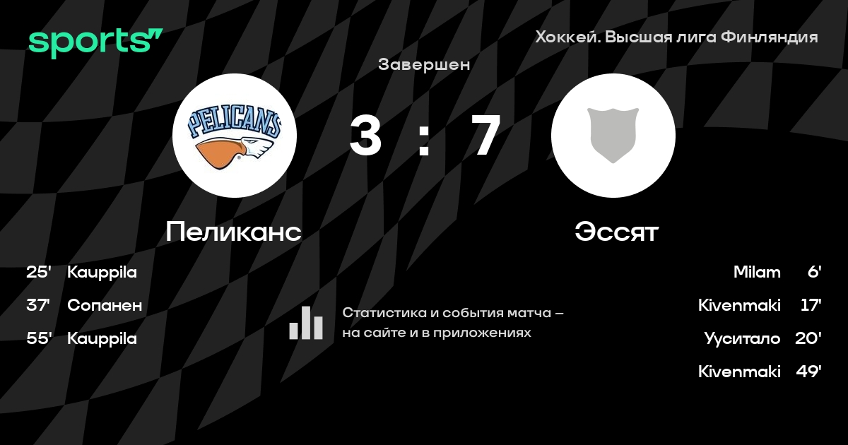 В прошедшем матче в рамках турнира Хоккей. Высшая лига Финляндия состоялась встреча команд Пеликанс - Эссят