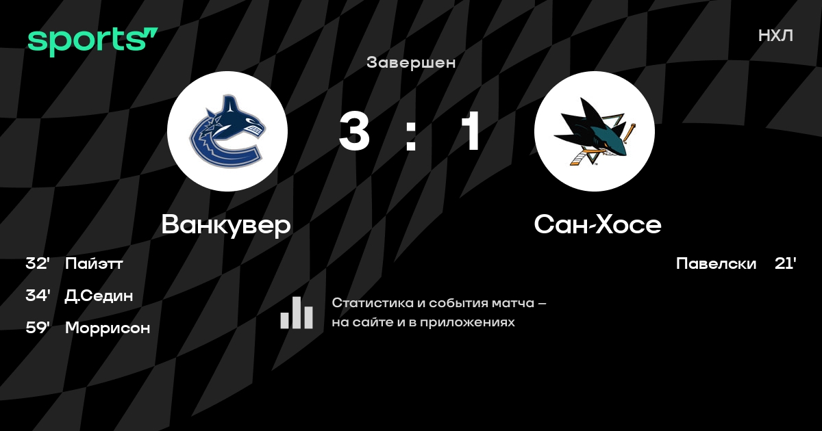 В прошедшем матче в рамках турнира НХЛ состоялась встреча команд Ванкувер - Сан-Хосе в городе Ванкувер (Канада) на стадионе Rogers Arena (вместимость - 18860)