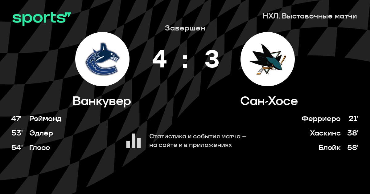 В прошедшем матче в рамках турнира НХЛ. Выставочные матчи состоялась встреча команд Ванкувер - Сан-Хосе в городе Ванкувер (Канада) на стадионе Rogers Arena (вместимость - 18860)