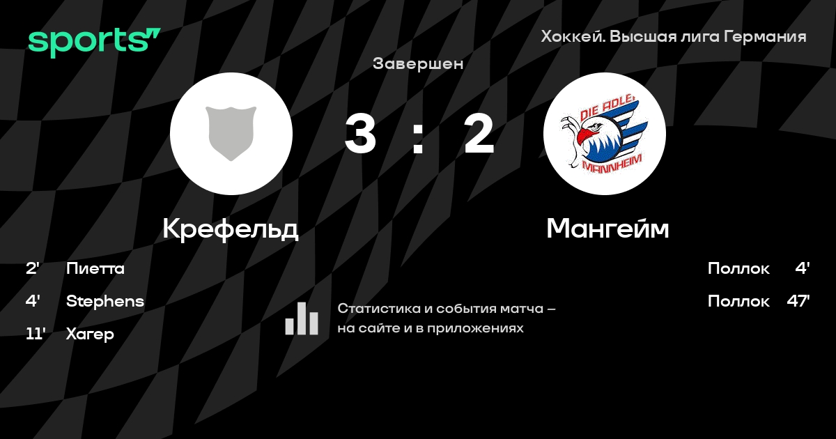 В прошедшем матче в рамках турнира Хоккей. Высшая лига Германия состоялась встреча команд Крефельд - Мангейм