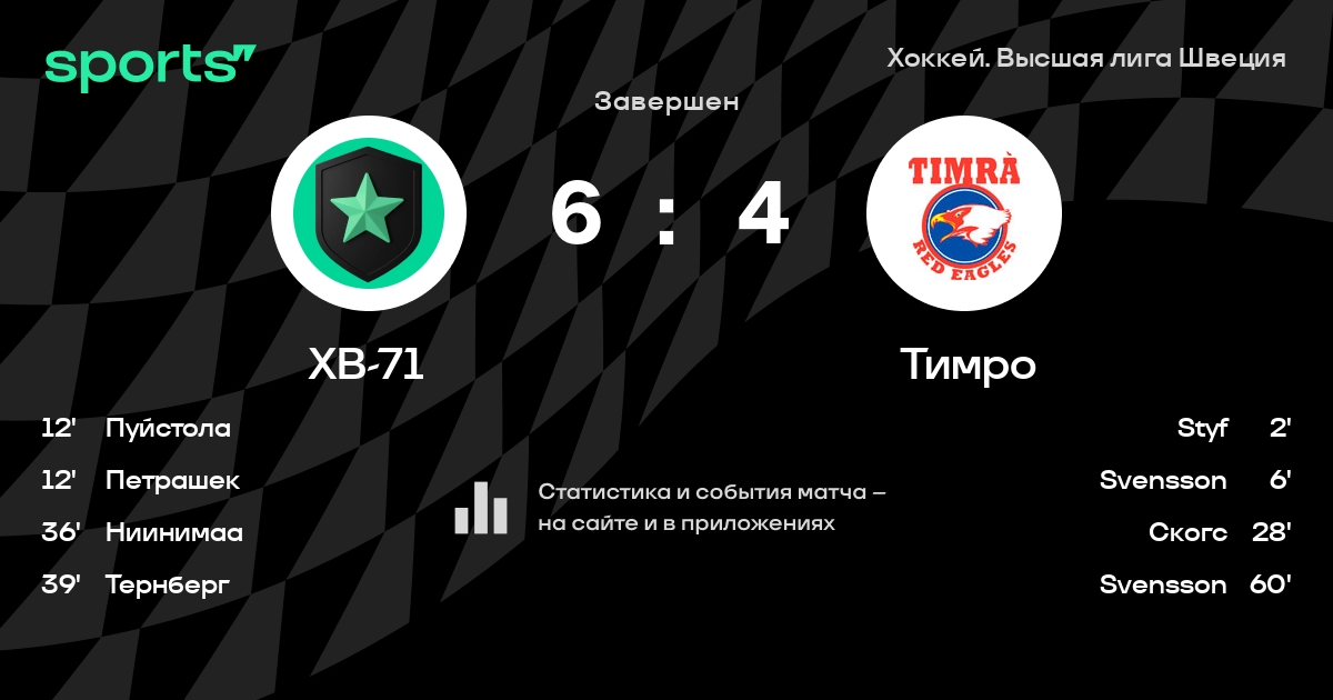 В прошедшем матче в рамках турнира Хоккей. Высшая лига Швеция состоялась встреча команд ХВ-71 - Тимро
