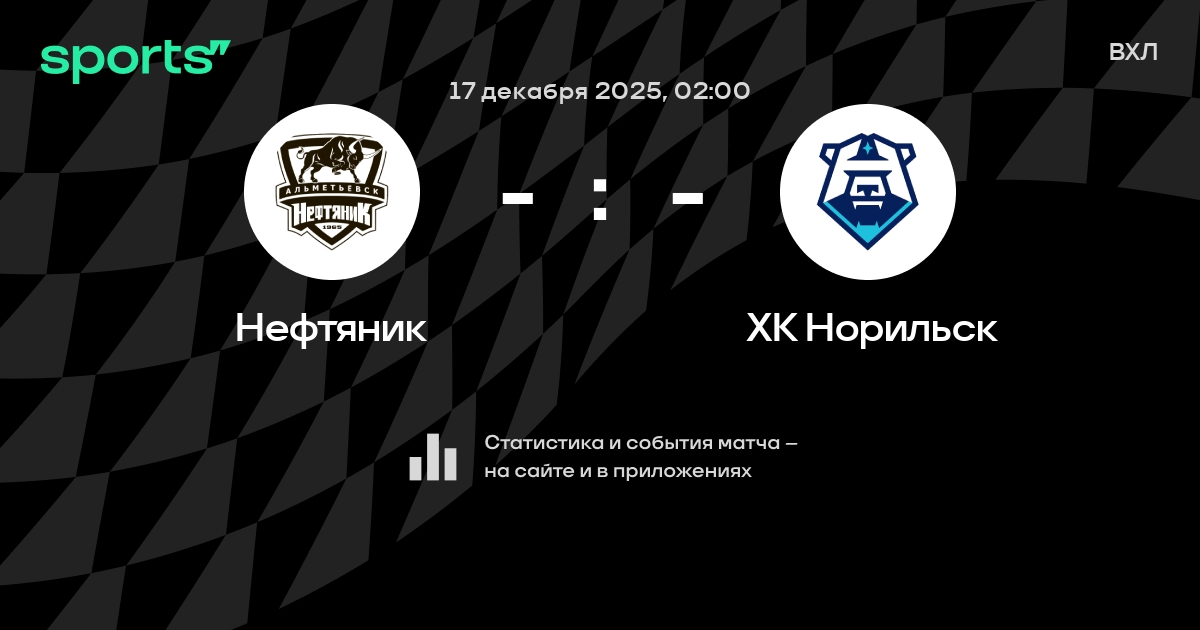 В предстоящем матче в рамках турнира ВХЛ пройдет встреча команд Нефтяник - ХК Норильск в городе на стадионе Dvorets Sporta Yubileynyy.