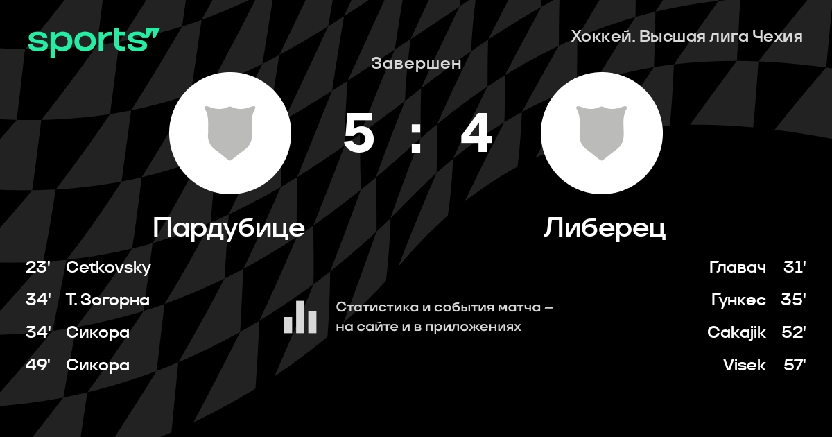 В прошедшем матче в рамках турнира Хоккей. Высшая лига Чехия состоялась встреча команд Пардубице - Либерец