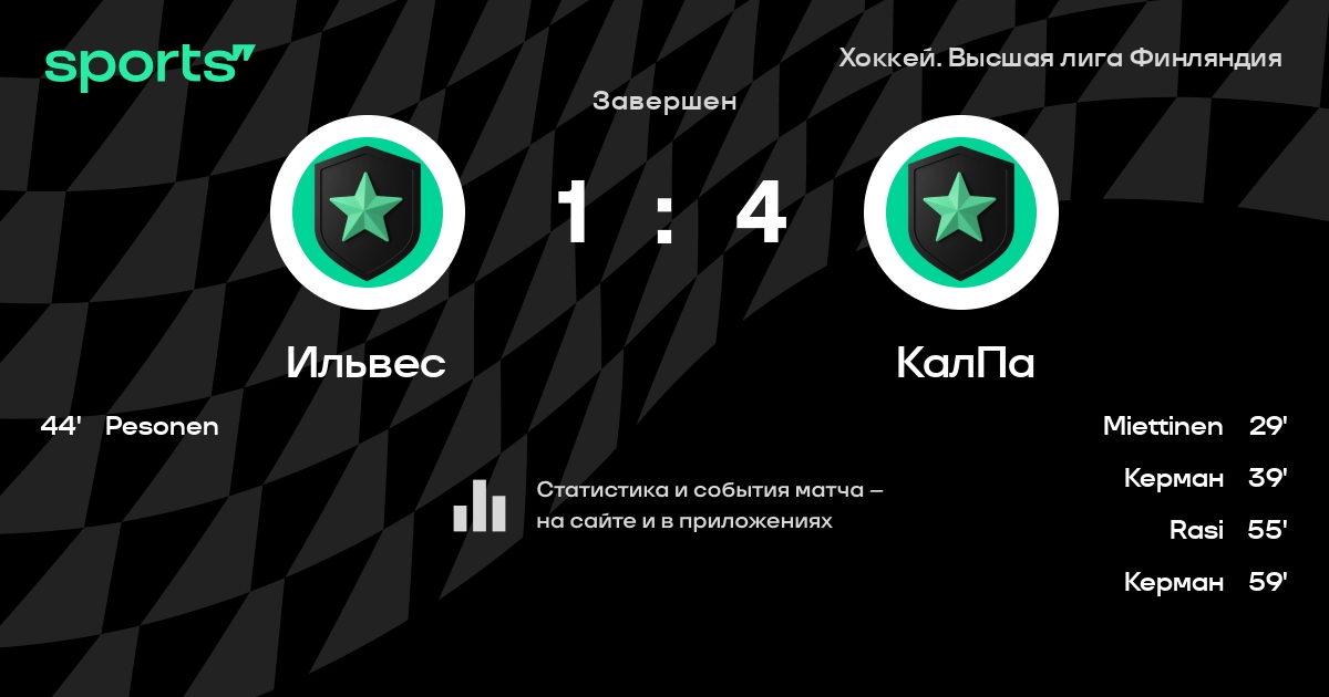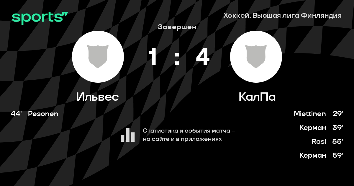 В прошедшем матче в рамках турнира Хоккей. Высшая лига Финляндия состоялась встреча команд Ильвес - КалПа