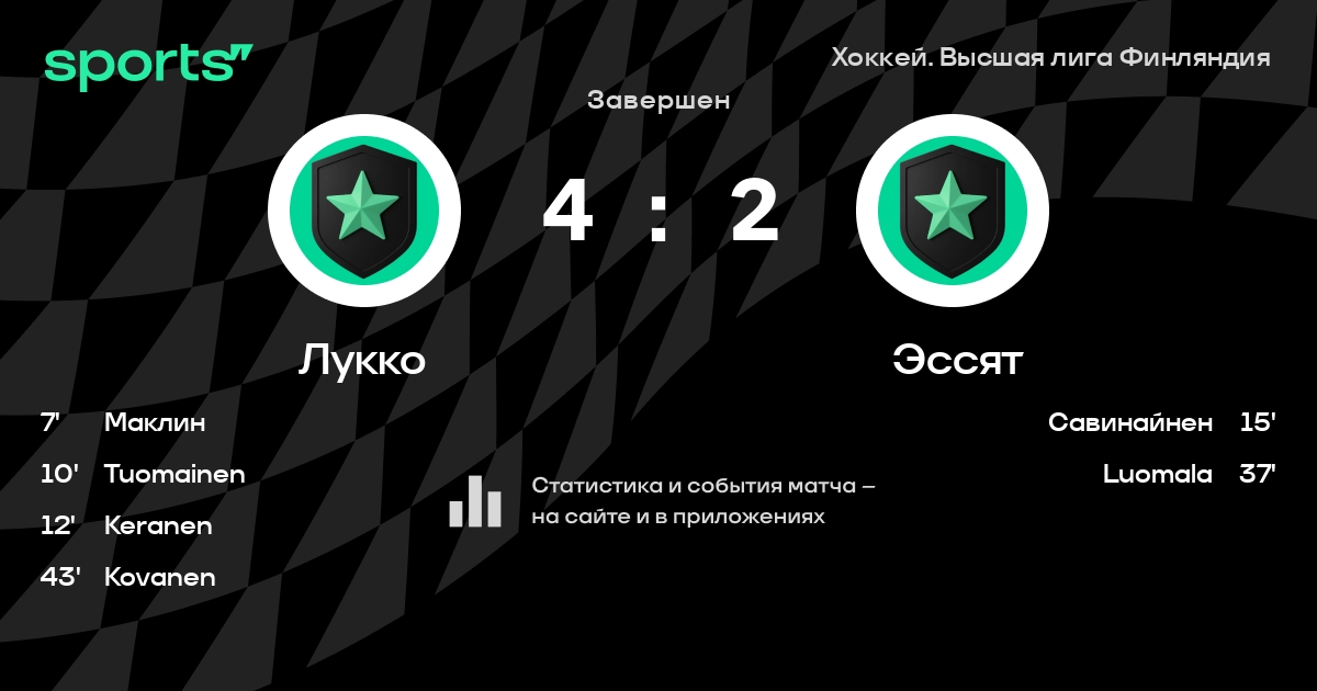 В прошедшем матче в рамках турнира Хоккей. Высшая лига Финляндия состоялась встреча команд Лукко - Эссят