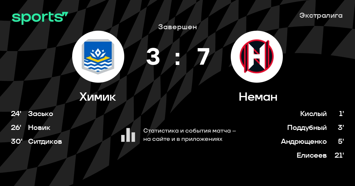 В прошедшем матче в рамках турнира Экстралига состоялась встреча команд Химик - Неман в городе Новополоцк (Беларусь) на стадионе Дворец культуры и спорта (вместимость - 1200)