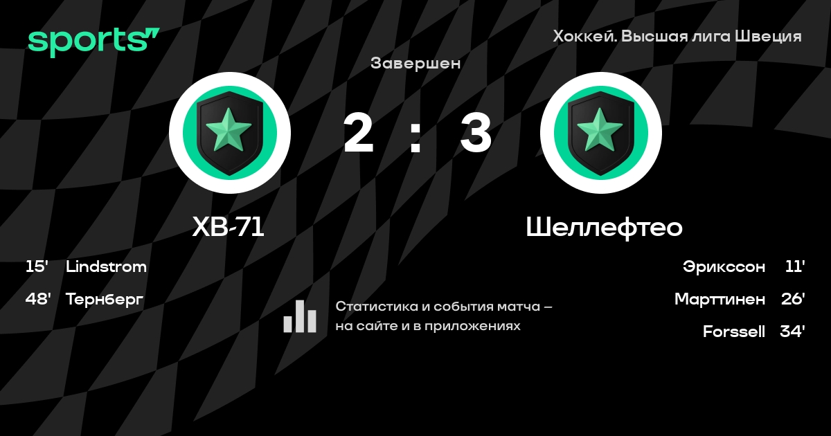 В прошедшем матче в рамках турнира Хоккей. Высшая лига Швеция состоялась встреча команд ХВ-71 - Шеллефтео