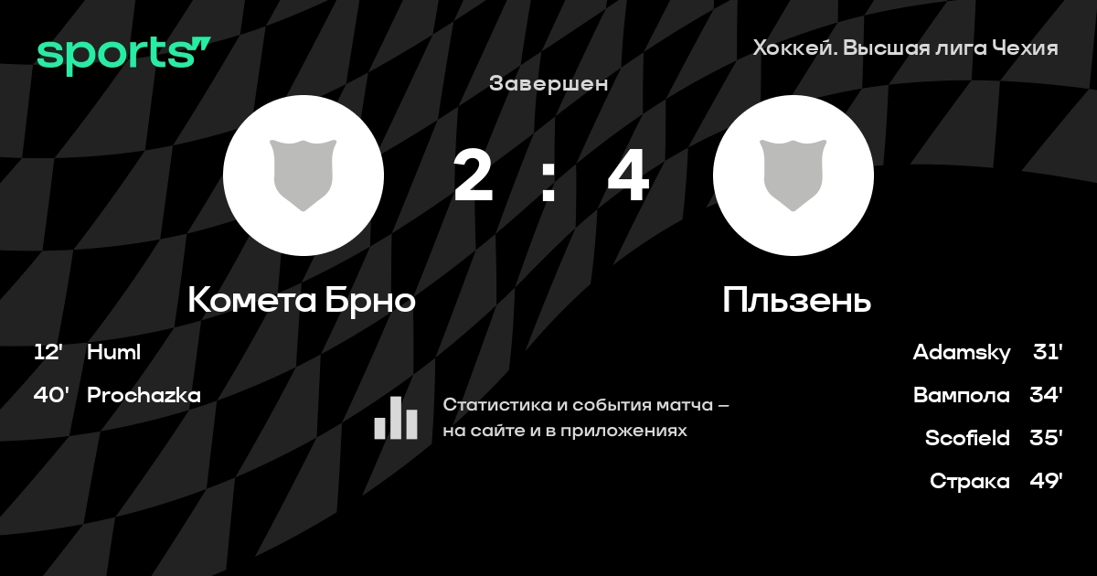 В прошедшем матче в рамках турнира Хоккей. Высшая лига Чехия состоялась встреча команд Комета Брно - Пльзень