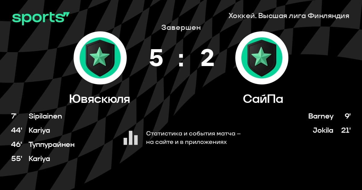В прошедшем матче в рамках турнира Хоккей. Высшая лига Финляндия состоялась встреча команд Ювяскюля - СайПа