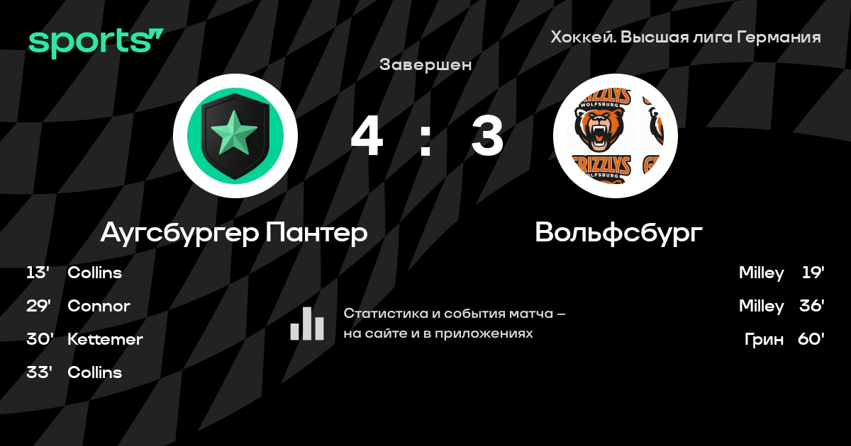 В прошедшем матче в рамках турнира Хоккей. Высшая лига Германия состоялась встреча команд Аугсбургер Пантер - Вольфсбург