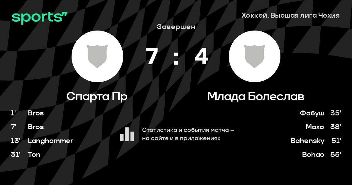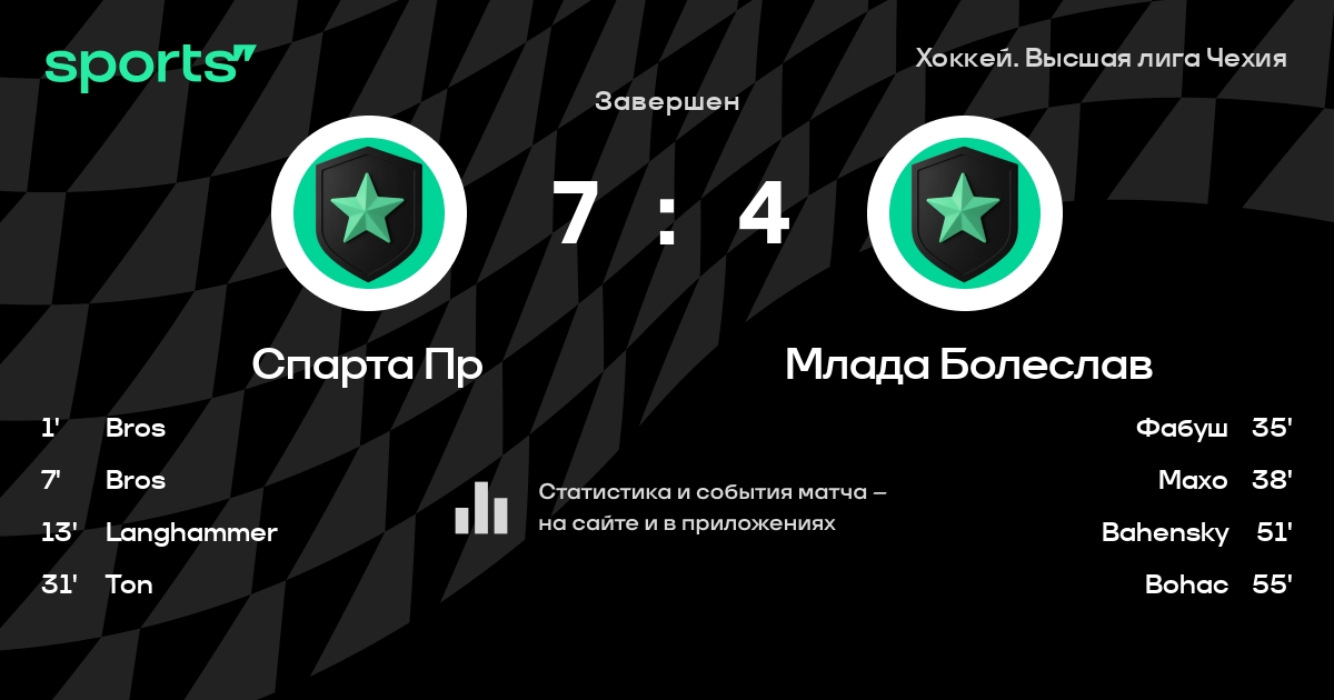 В прошедшем матче в рамках турнира Хоккей. Высшая лига Чехия состоялась встреча команд Спарта Пр - Млада Болеслав