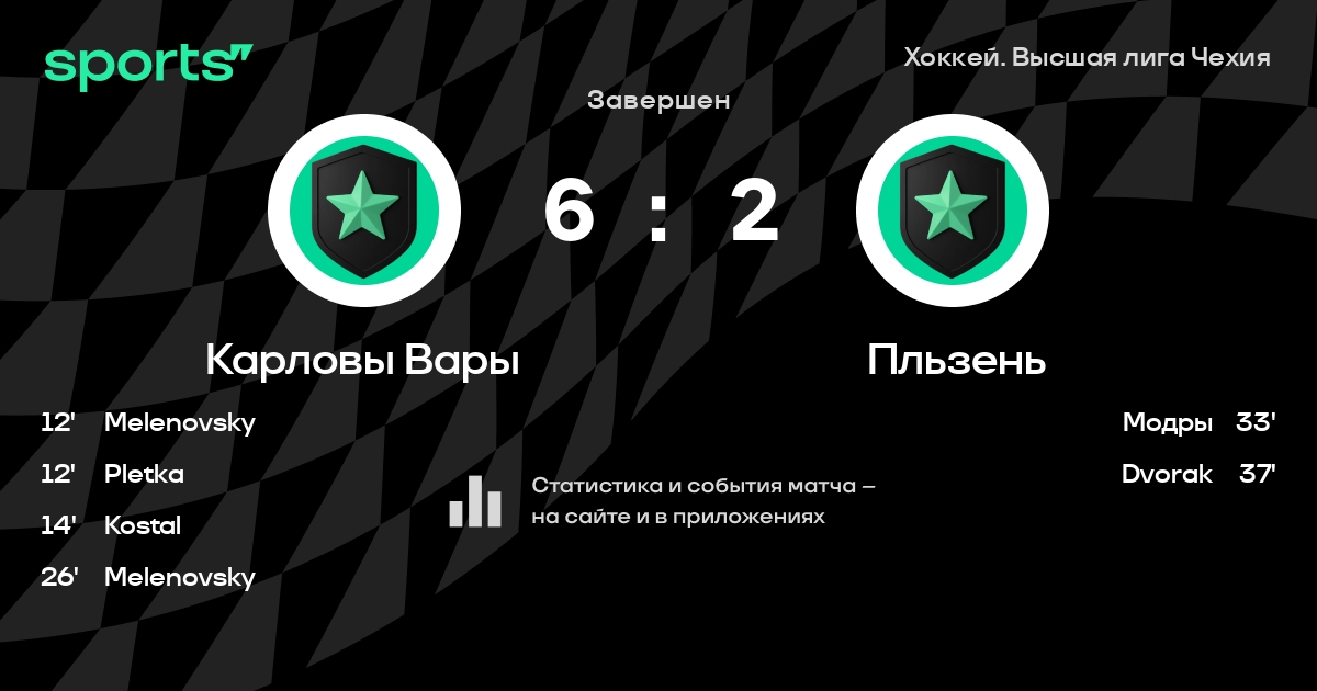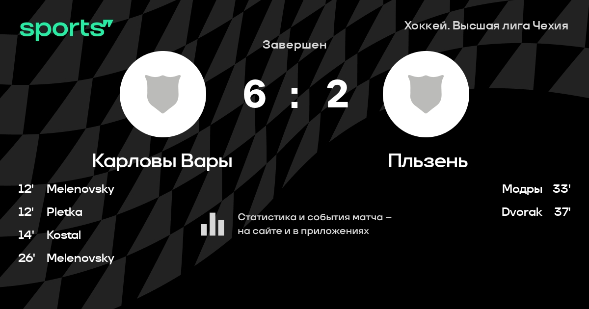 В прошедшем матче в рамках турнира Хоккей. Высшая лига Чехия состоялась встреча команд Карловы Вары - Пльзень