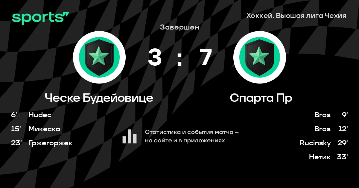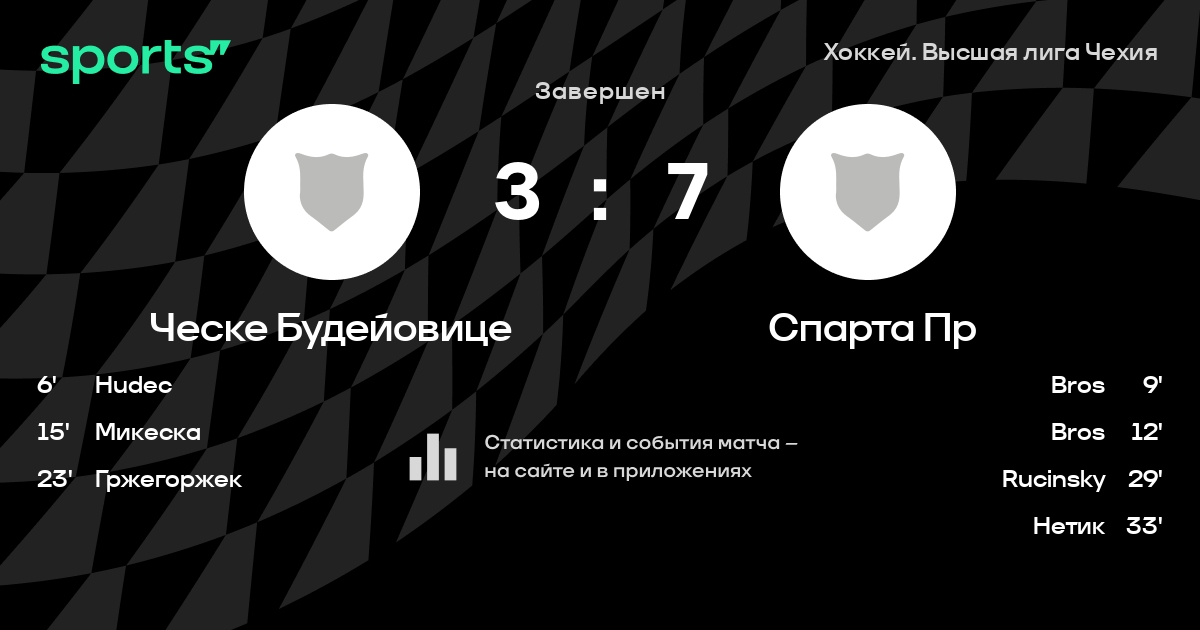 В прошедшем матче в рамках турнира Хоккей. Высшая лига Чехия состоялась встреча команд Ческе Будейовице - Спарта Пр