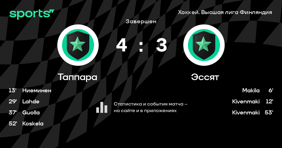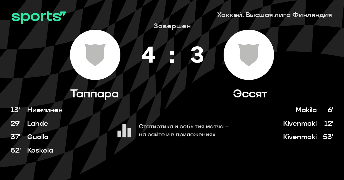 В прошедшем матче в рамках турнира Хоккей. Высшая лига Финляндия состоялась встреча команд Таппара - Эссят