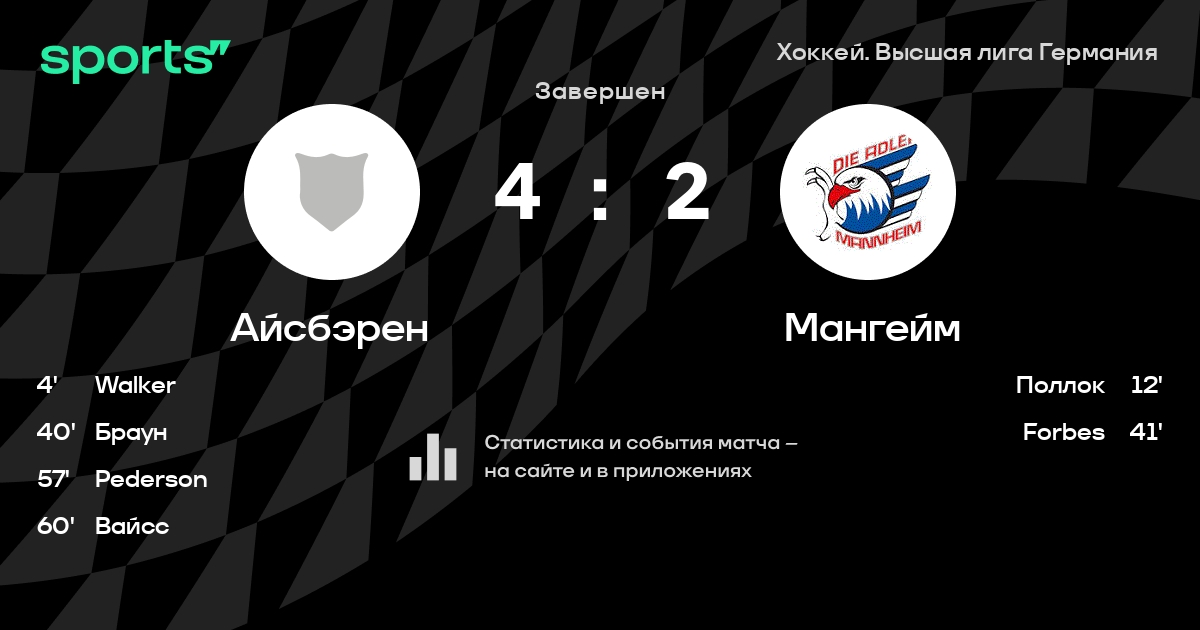 В прошедшем матче в рамках турнира Хоккей. Высшая лига Германия состоялась встреча команд Айсбэрен - Мангейм