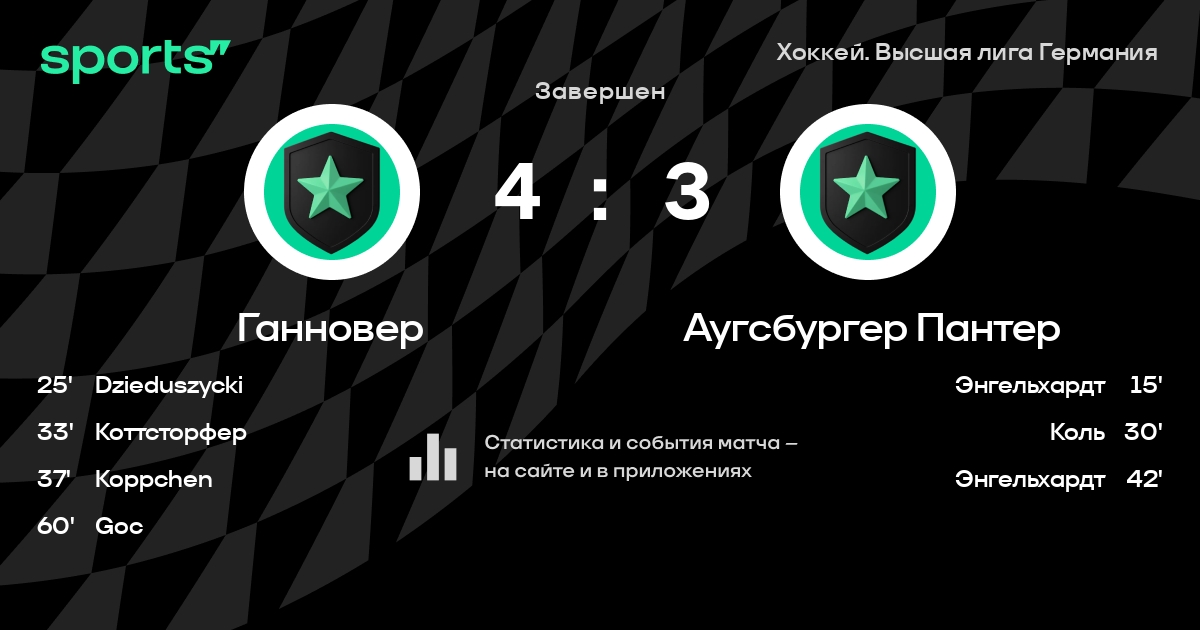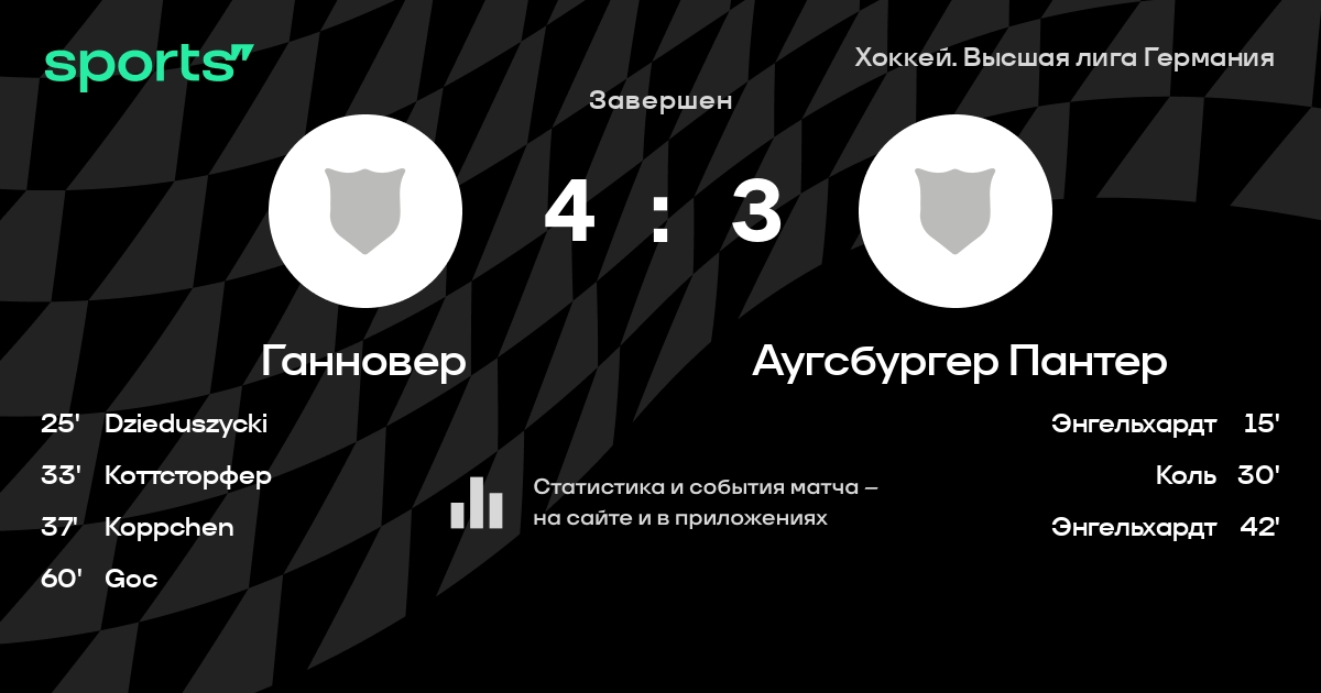 В прошедшем матче в рамках турнира Хоккей. Высшая лига Германия состоялась встреча команд Ганновер - Аугсбургер Пантер