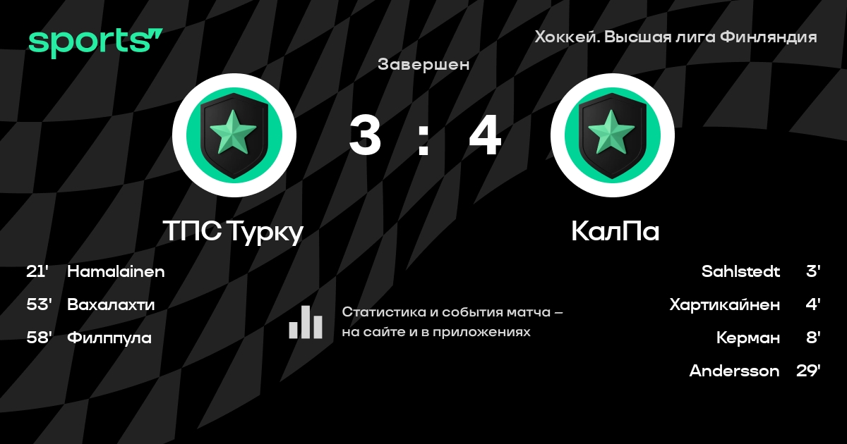 В прошедшем матче в рамках турнира Хоккей. Высшая лига Финляндия состоялась встреча команд ТПС Турку - КалПа