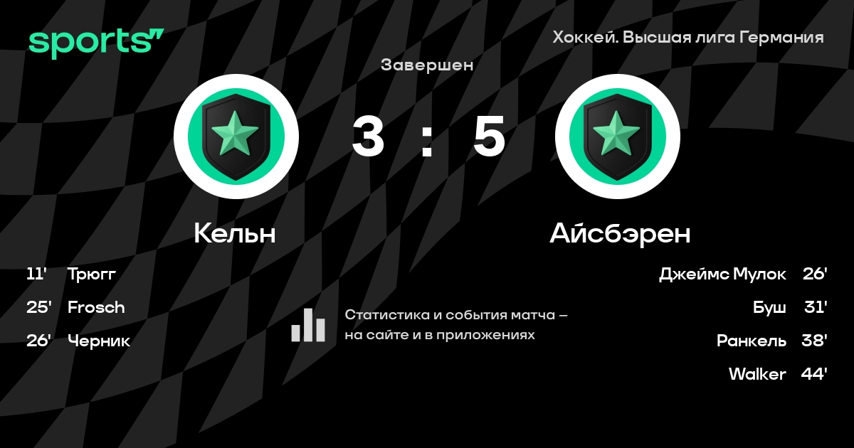 В прошедшем матче в рамках турнира Хоккей. Высшая лига Германия состоялась встреча команд Кельн - Айсбэрен