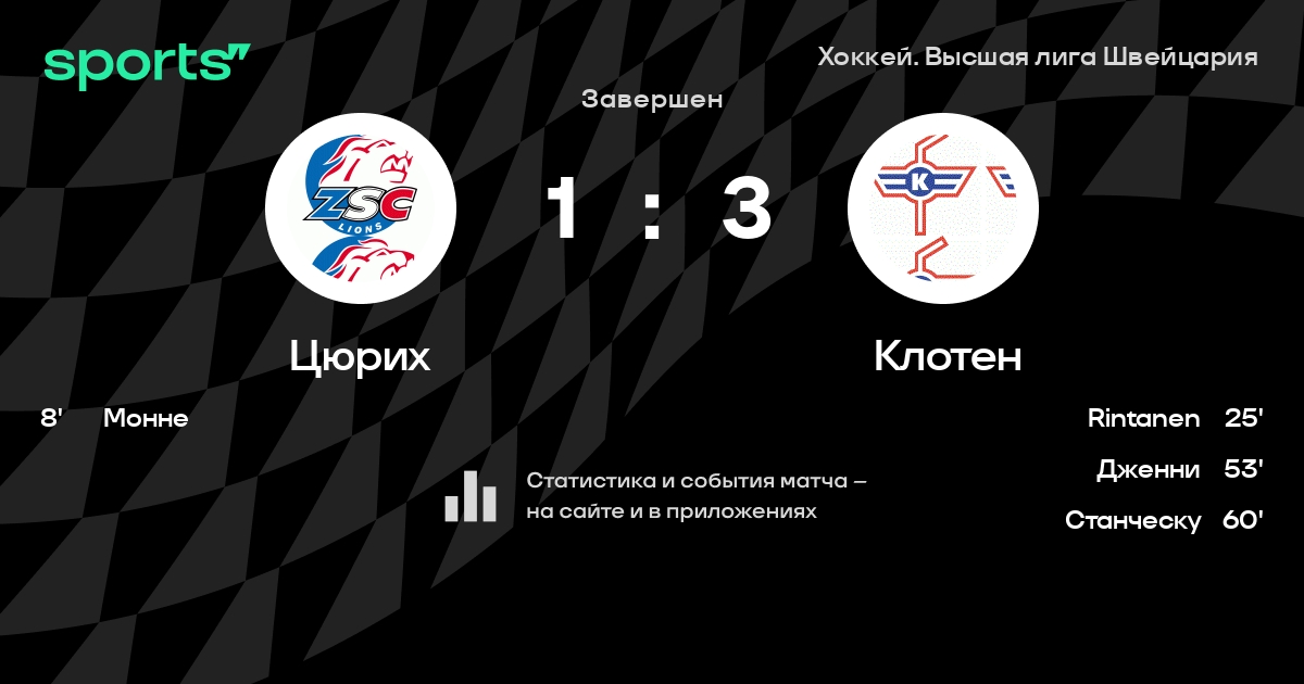 В прошедшем матче в рамках турнира Хоккей. Высшая лига Швейцария состоялась встреча команд Цюрих - Клотен
