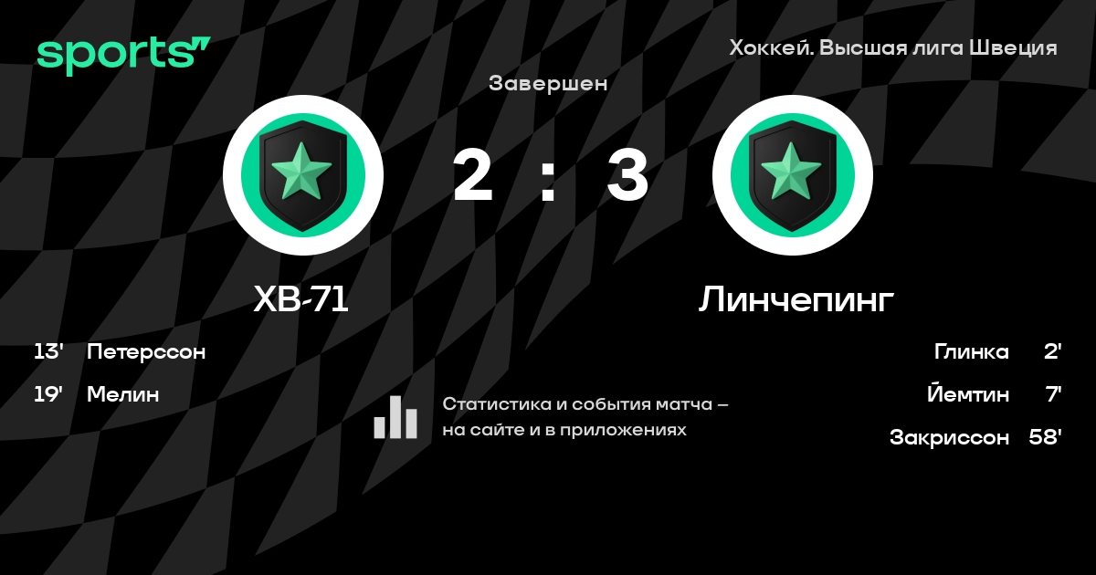 В прошедшем матче в рамках турнира Хоккей. Высшая лига Швеция состоялась встреча команд ХВ-71 - Линчепинг