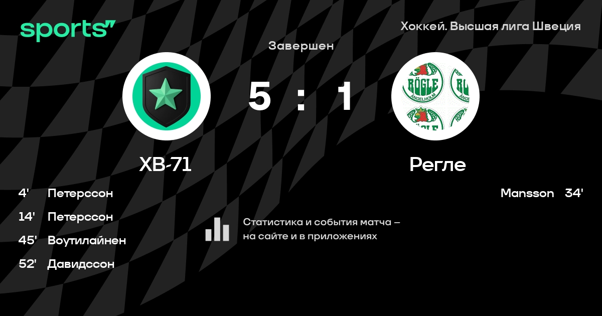 В прошедшем матче в рамках турнира Хоккей. Высшая лига Швеция состоялась встреча команд ХВ-71 - Регле