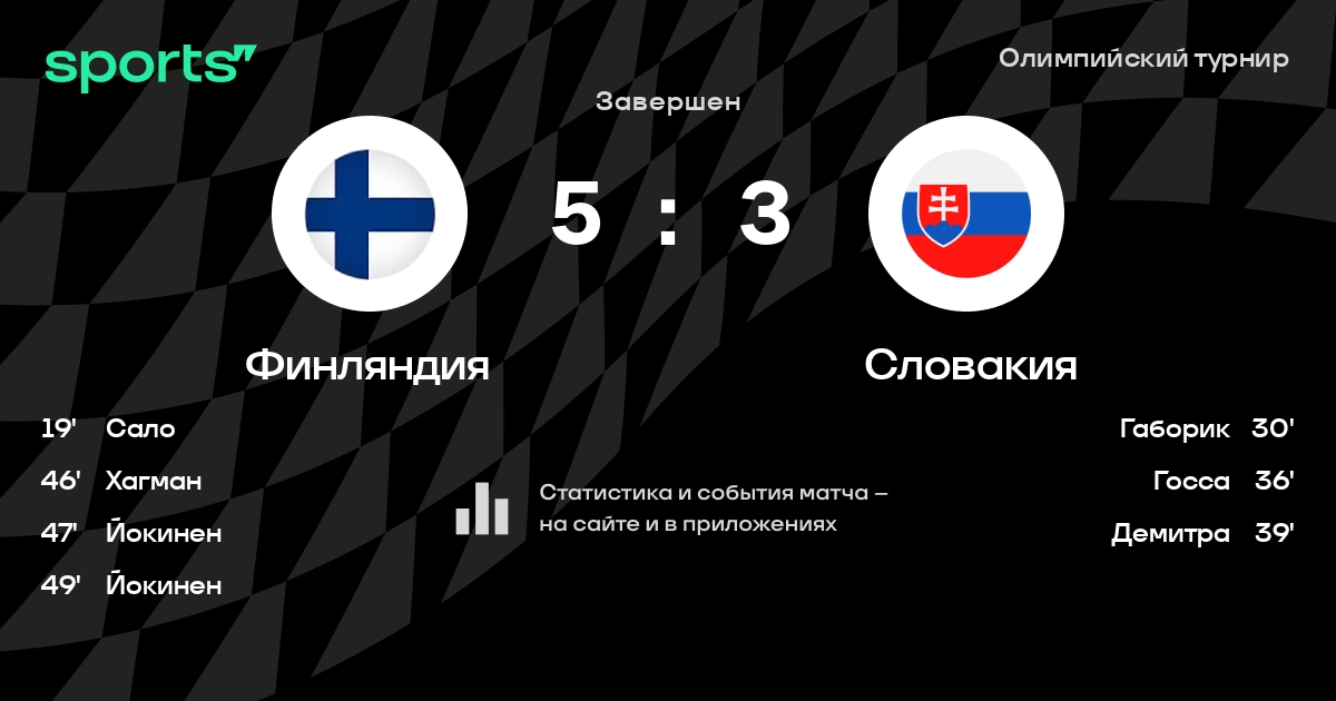 В прошедшем матче в рамках турнира Олимпийский турнир (Матч за третье место) состоялась встреча команд Финляндия - Словакия