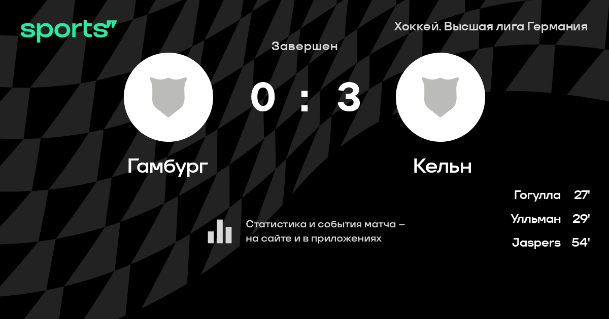 В прошедшем матче в рамках турнира Хоккей. Высшая лига Германия состоялась встреча команд Гамбург - Кельн