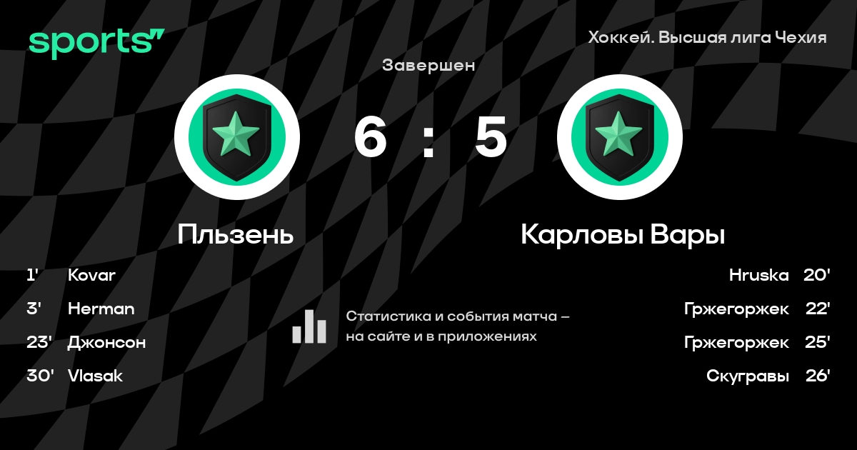 В прошедшем матче в рамках турнира Хоккей. Высшая лига Чехия состоялась встреча команд Пльзень - Карловы Вары