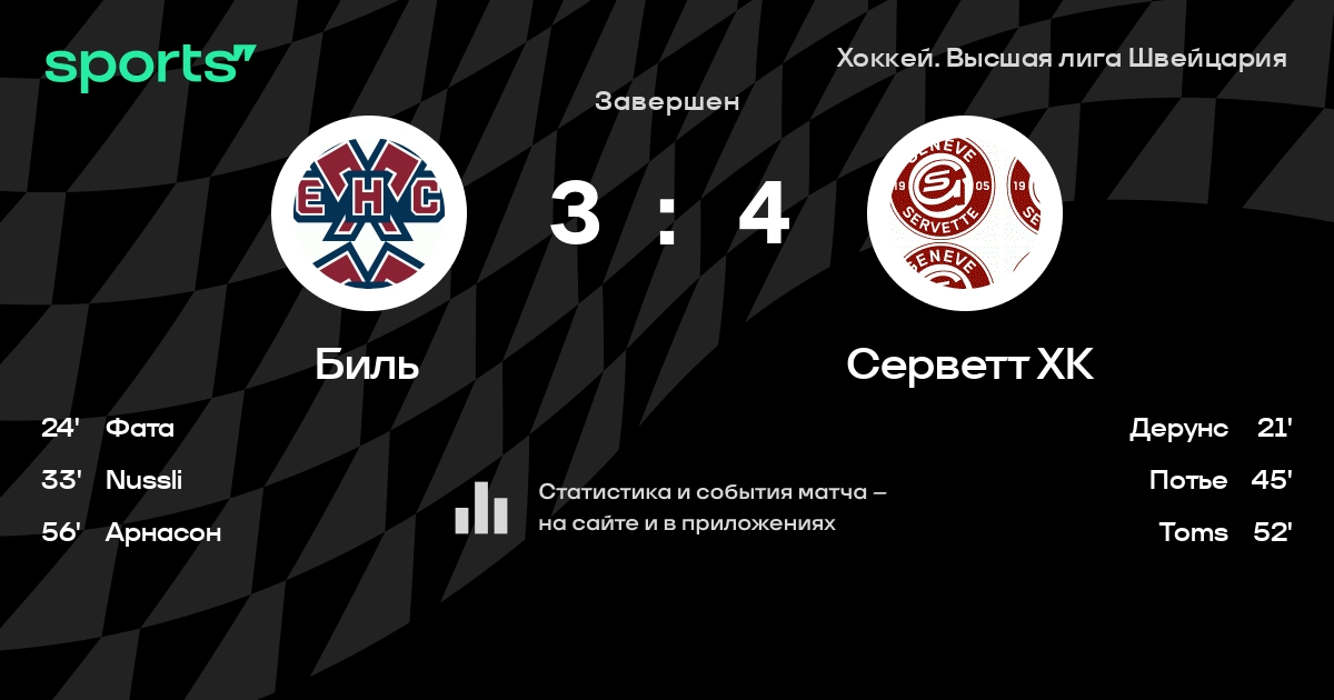 В прошедшем матче в рамках турнира Хоккей. Высшая лига Швейцария состоялась встреча команд Биль - Серветт ХК