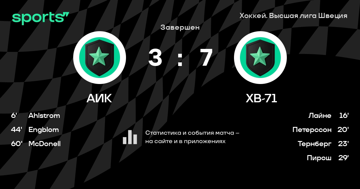 В прошедшем матче в рамках турнира Хоккей. Высшая лига Швеция состоялась встреча команд АИК - ХВ-71