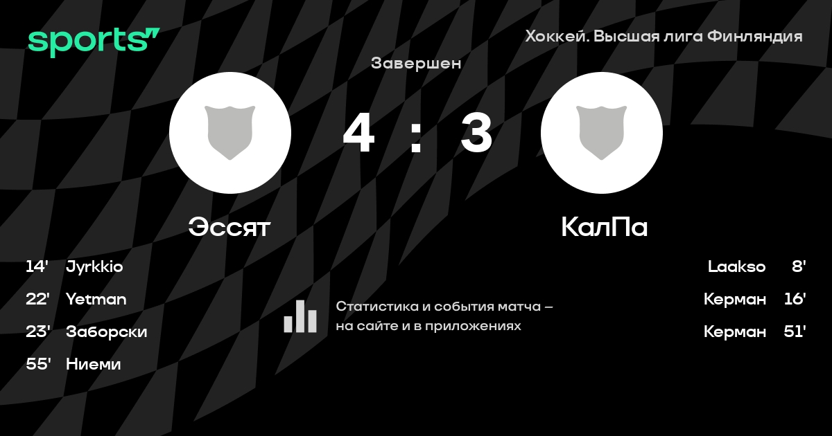 В прошедшем матче в рамках турнира Хоккей. Высшая лига Финляндия состоялась встреча команд Эссят - КалПа