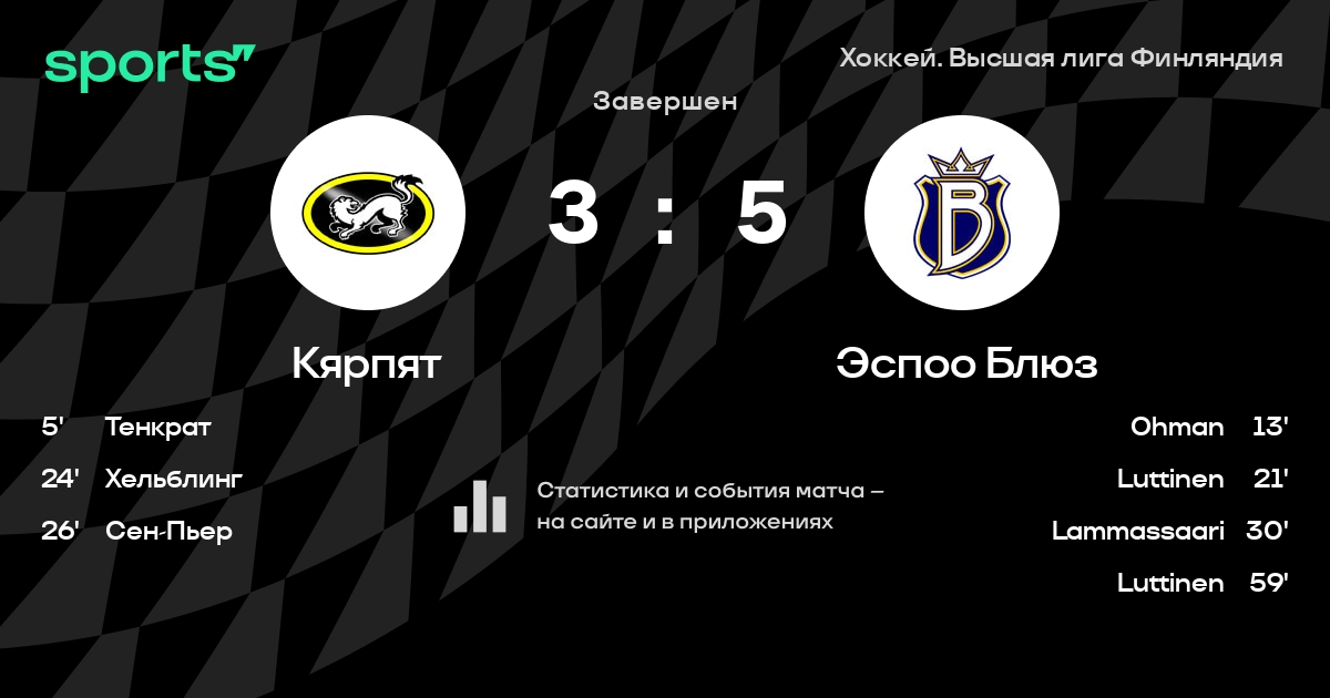 В прошедшем матче в рамках турнира Хоккей. Высшая лига Финляндия состоялась встреча команд Кярпят - Эспоо Блюз