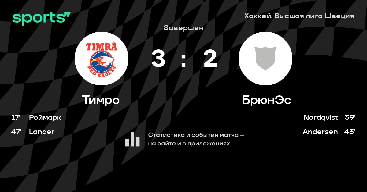 В прошедшем матче в рамках турнира Хоккей. Высшая лига Швеция состоялась встреча команд Тимро - БрюнЭс
