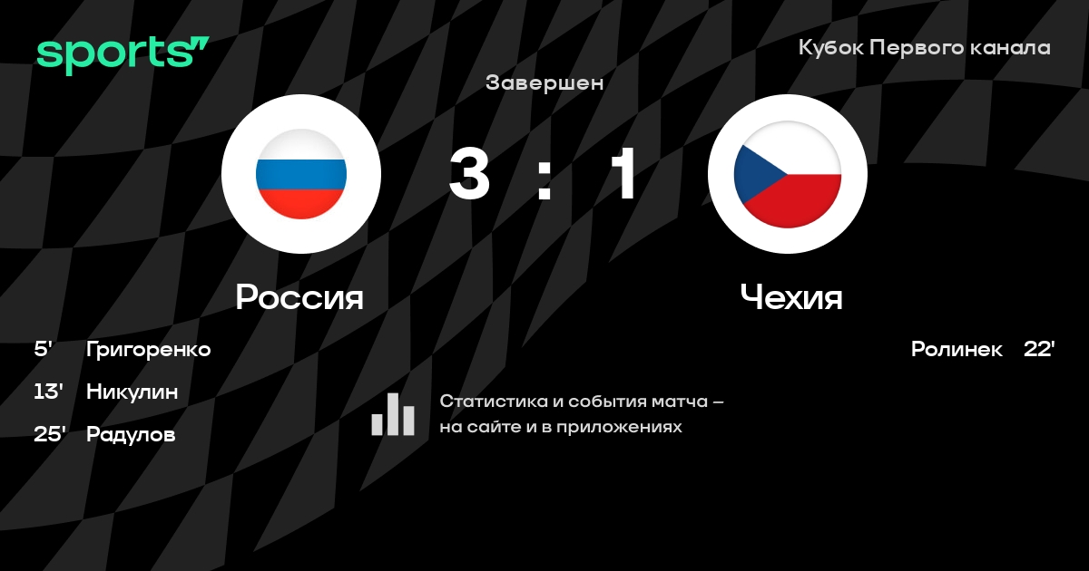 В прошедшем матче в рамках турнира Кубок Первого канала состоялась встреча команд Россия - Чехия в городе Москва (Россия) на стадионе Ледовый дворец на Ходынке