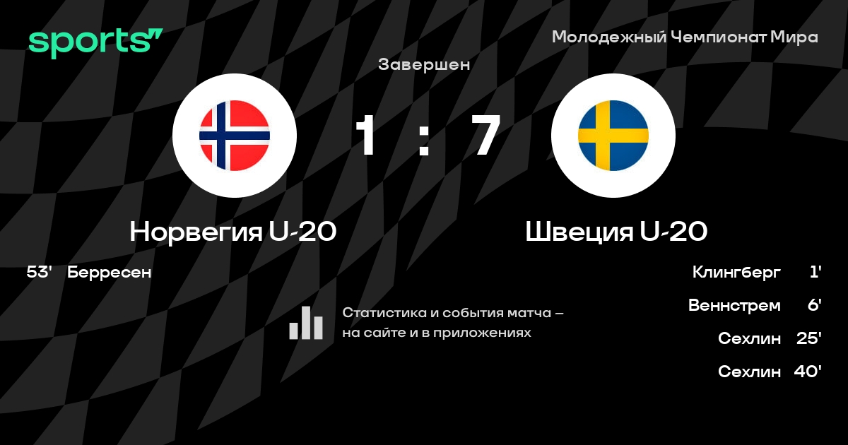 В прошедшем матче в рамках турнира Молодежный Чемпионат Мира (Групповой раунд) состоялась встреча команд Норвегия U-20 - Швеция U-20