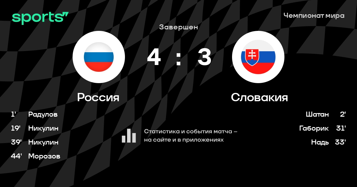В прошедшем матче в рамках турнира Чемпионат мира (Предварительный этап. 3 тур) состоялась встреча команд Россия - Словакия