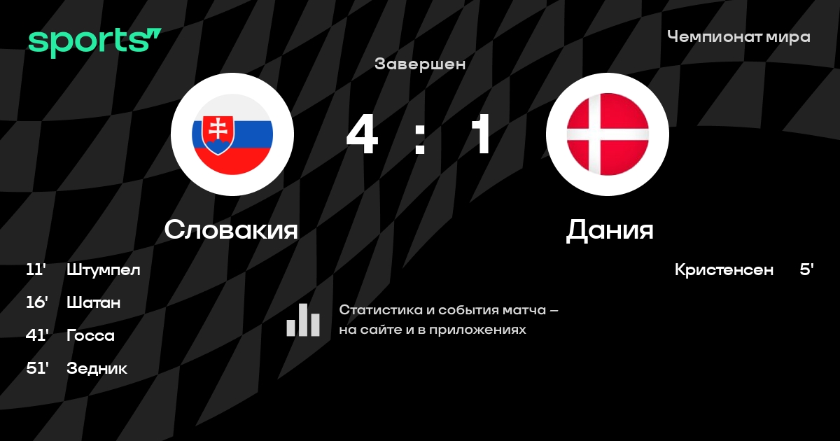 В прошедшем матче в рамках турнира Чемпионат мира (Квалификационный этап. 3 тур) состоялась встреча команд Словакия - Дания