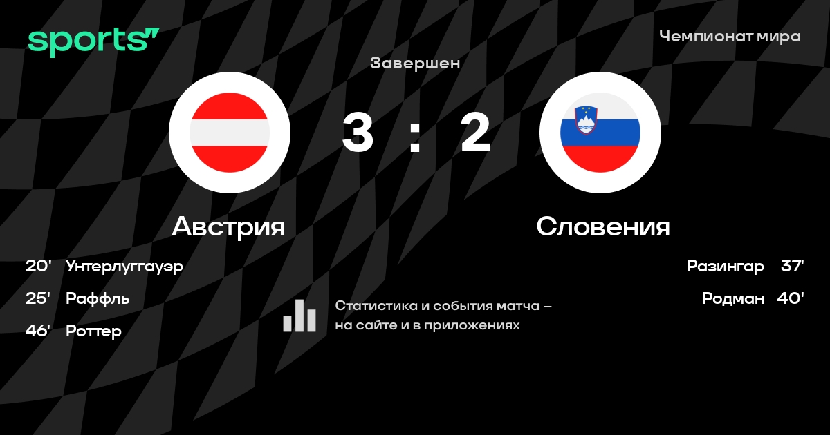 В прошедшем матче в рамках турнира Чемпионат мира (Утешительный раунд. 2 тур) состоялась встреча команд Австрия - Словения