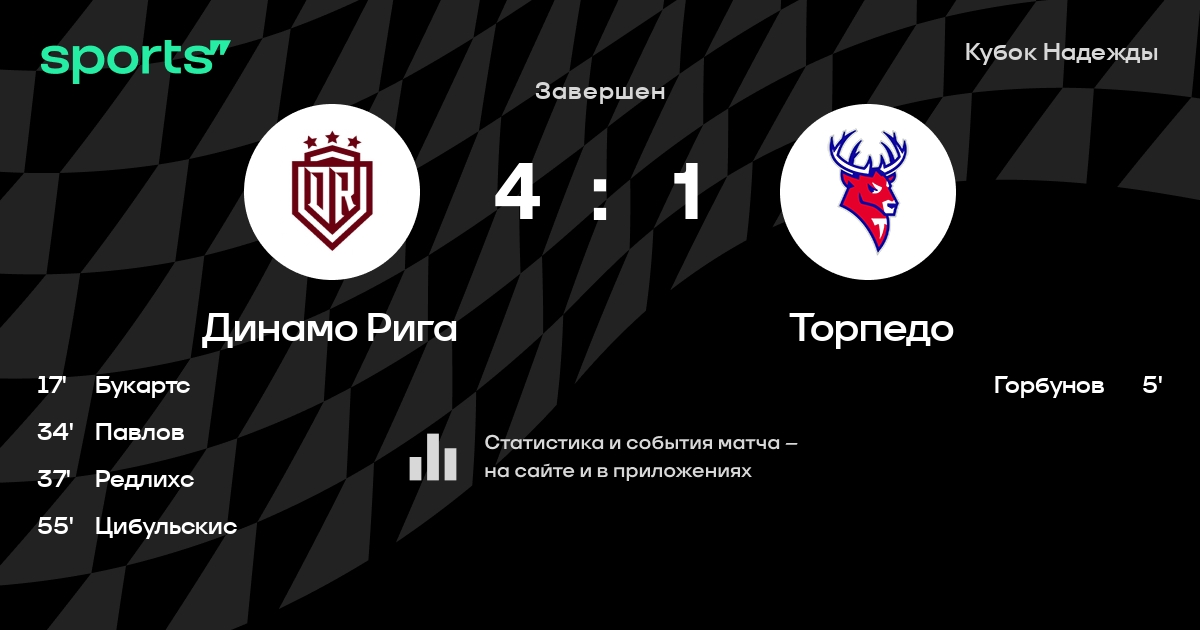 В прошедшем матче в рамках турнира Кубок Надежды (Кубок Надежды. Квалификационный раунд) состоялась встреча команд Динамо Рига - Торпедо в городе Рига (Латвия) на стадионе Арена-Рига (вместимость - 12500)