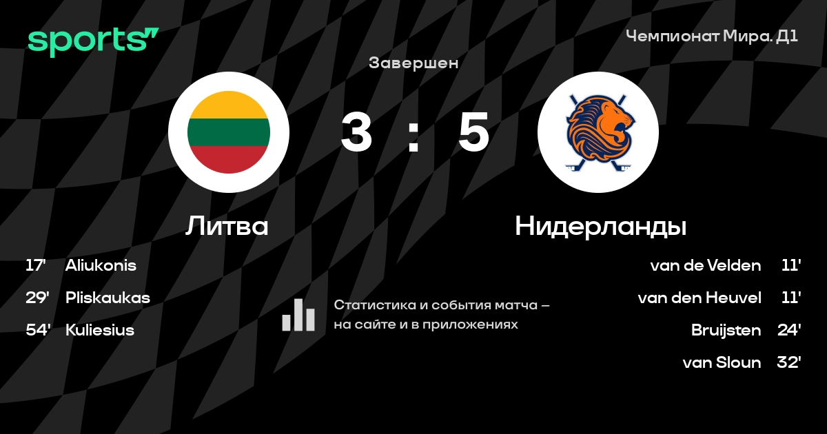 В прошедшем матче в рамках турнира Чемпионат Мира. Д1 (Группа B) состоялась встреча команд Литва - Нидерланды в городе Донецк (Украина) на стадионе Арена Дружба (вместимость - 4130)