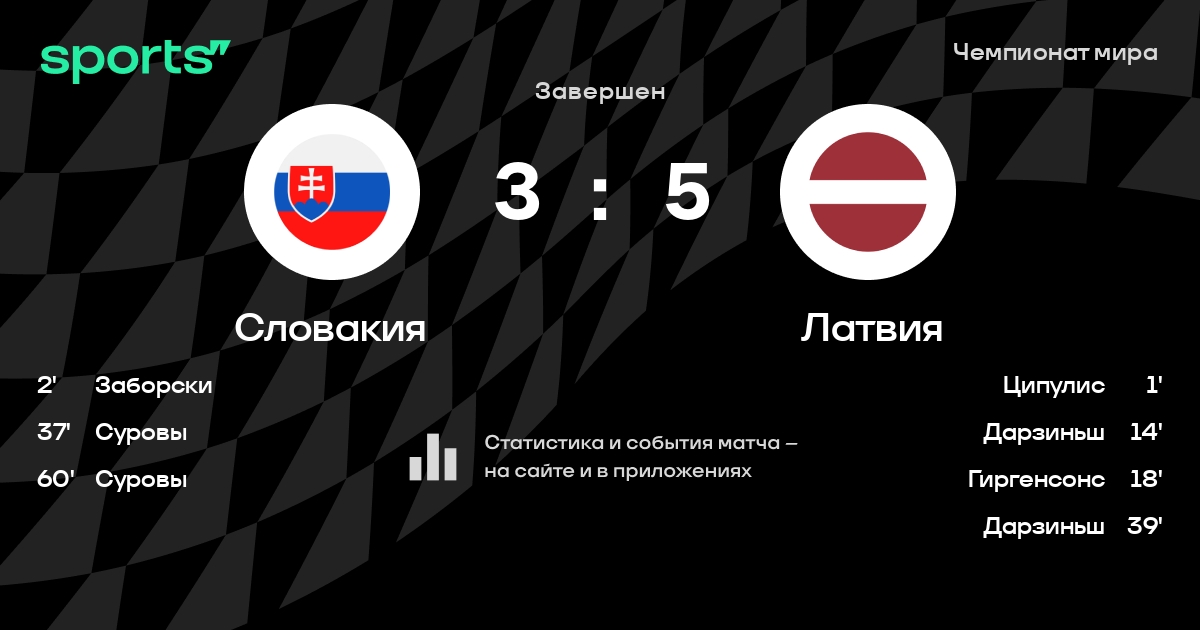 В прошедшем матче в рамках турнира Чемпионат мира (Группа B) состоялась встреча команд Словакия - Латвия в городе Хельсинки (Финляндия) на стадионе Хартвалл Арена (вместимость - 13506)