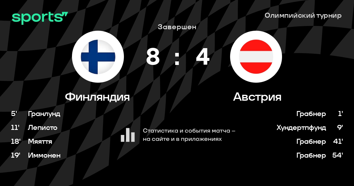 В прошедшем матче в рамках турнира Олимпийский турнир (1-й тур) состоялась встреча команд Финляндия - Австрия в городе Сочи (Россия) на стадионе Большой (вместимость - 12000)