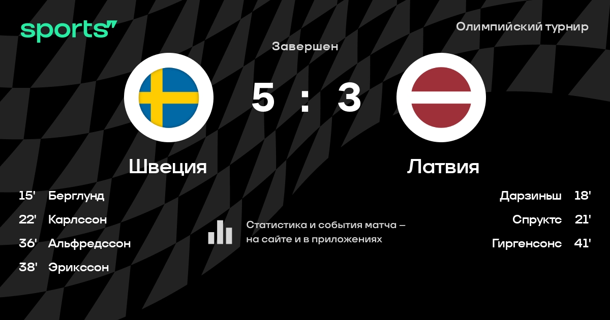 В прошедшем матче в рамках турнира Олимпийский турнир (3-й тур) состоялась встреча команд Швеция - Латвия в городе Сочи (Россия) на стадионе Шайба (вместимость - 7000)