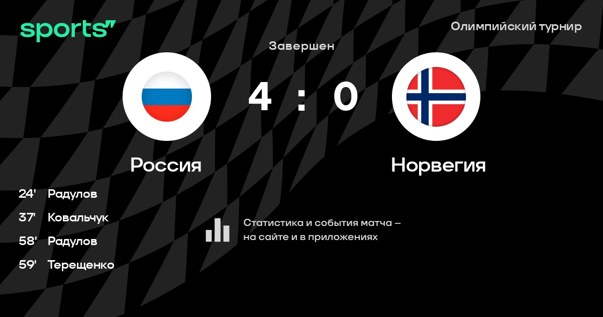 В прошедшем матче в рамках турнира Олимпийский турнир (Отборочный раунд) состоялась встреча команд Россия - Норвегия в городе Сочи (Россия) на стадионе Большой (вместимость - 12000)