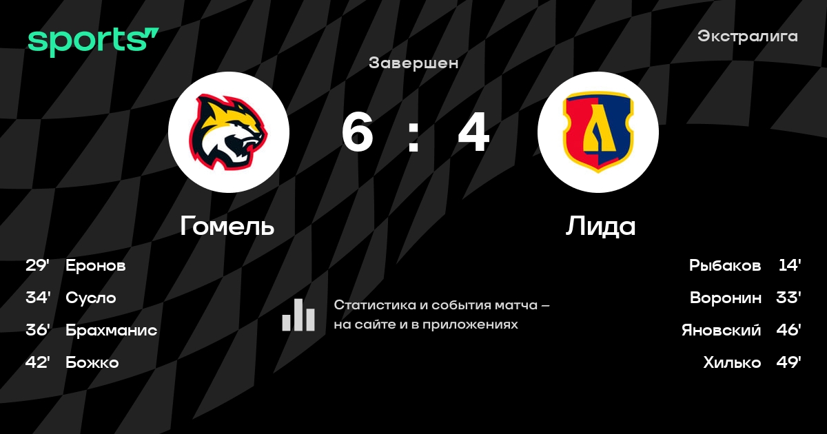 В прошедшем матче в рамках турнира Экстралига состоялась встреча команд Гомель - Лида в городе Гомель (Беларусь) на стадионе Ледовый дворец Гомель (вместимость - 2700)