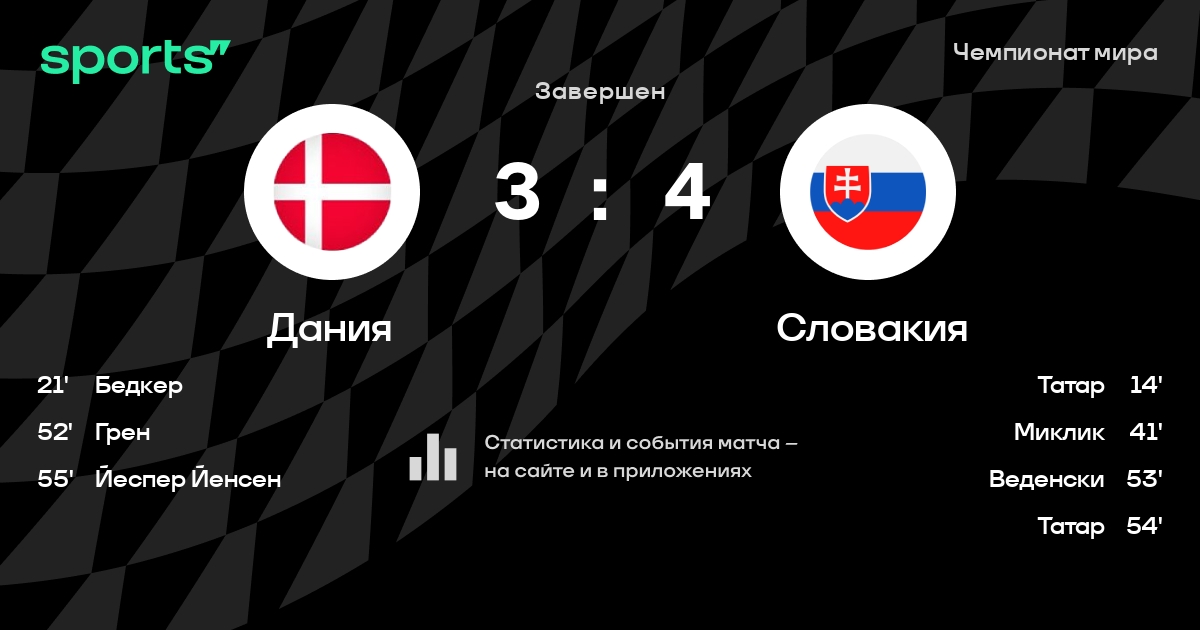 В прошедшем матче в рамках турнира Чемпионат мира (7-й тур) состоялась встреча команд Дания - Словакия в городе Минск (Беларусь) на стадионе Чижовка-Арена (вместимость - 9487)