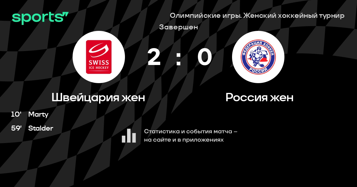 В прошедшем матче в рамках турнира Олимпийские игры. Женский хоккейный турнир состоялась встреча команд Швейцария жен - Россия жен в городе Сочи (Россия) на стадионе Шайба (вместимость - 7000)